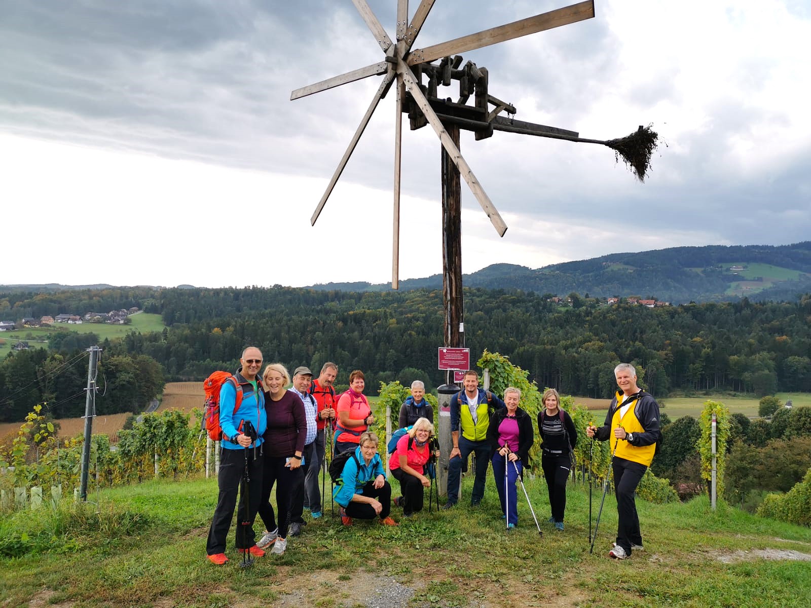 Die Wanderung führte mit einigen steilen Passagen vom Parkplatz in Pürgg aus zur Schröflalm und auf das in 1259 m Höhe gelegene Gindlhorn. Von dort hatten wir wunderbare Ausblicke auf Pürgg, nach Bad Mitterndorf,  Wörschachwald und zum Multereck. Zurück ging es über einen Waldweg zum Gasthof Dachsteinblick und den malerischen Marterlweg entlang des alten Kirchweges bis zum Ausgangspunkt in Pürgg.